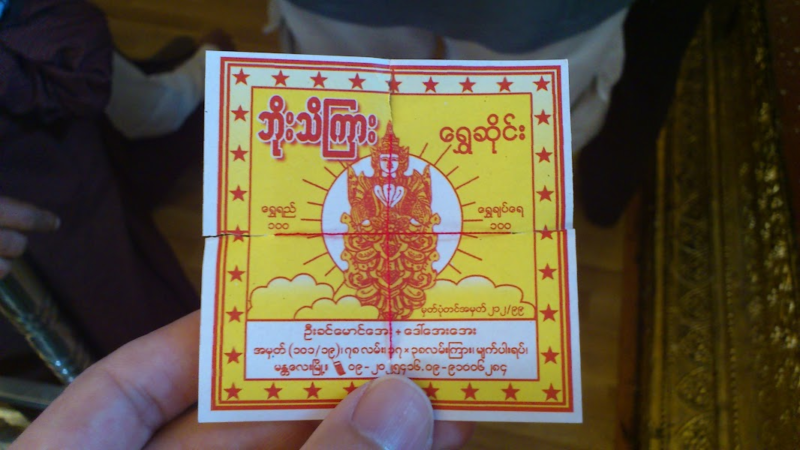 境内で1000チャット(約100円)を払うと金箔を3枚買うことができ、仏像の金色が剥げているところに自分でこの金箔を貼り付けます。もっとお金がある人は1枚で数十万円もする大きな金箔も販売されています。こうした熱心な信者の寄付によって、この金色に輝く莫大な寺院の仏塔や仏像が維持・発展しているのです。