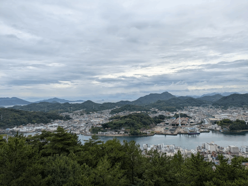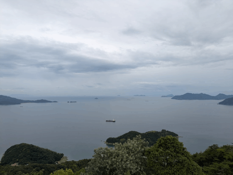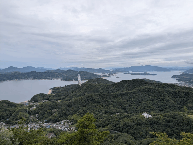 ランチ後は、しまなみ海道に入って最初の向島にある高見山展望台へ。あいにくの曇天でしたが、瀬戸内海に浮かぶ島々を一望できました。