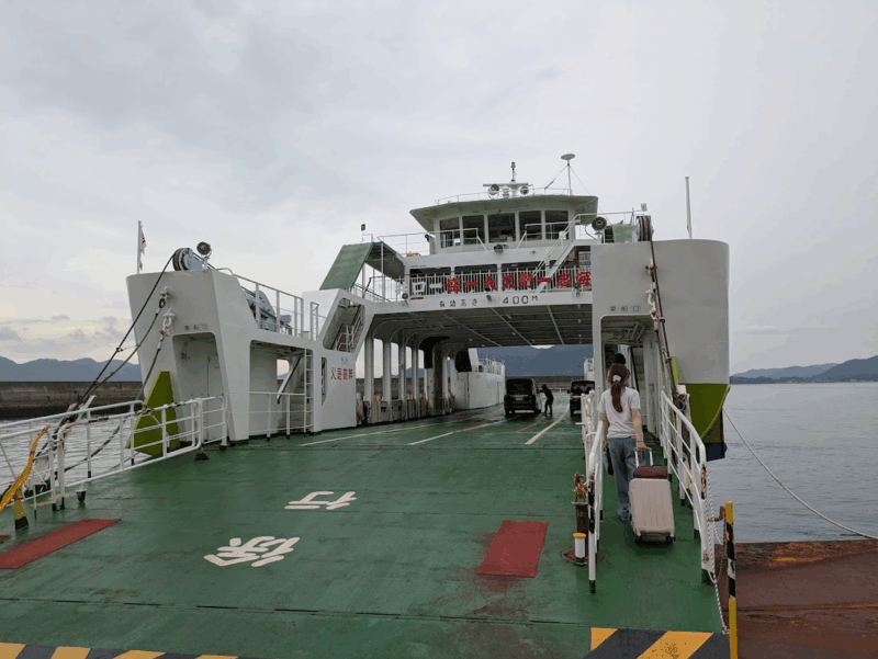そして、大久野島へ渡るフェリーが発着する盛港へ。車は港の駐車場に停めて、予定よりも1本早い14:40の便で大久野島へ出発しました。
