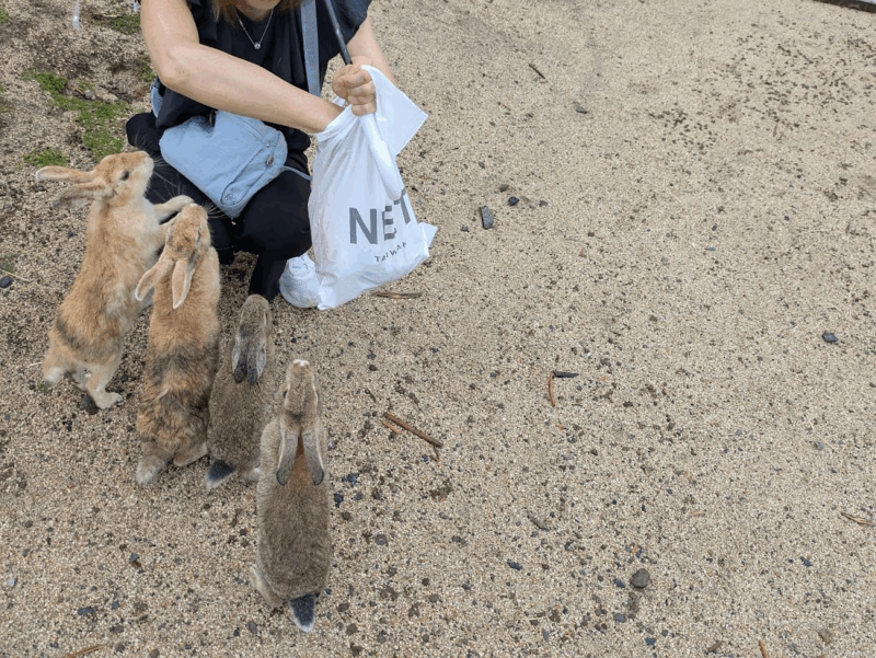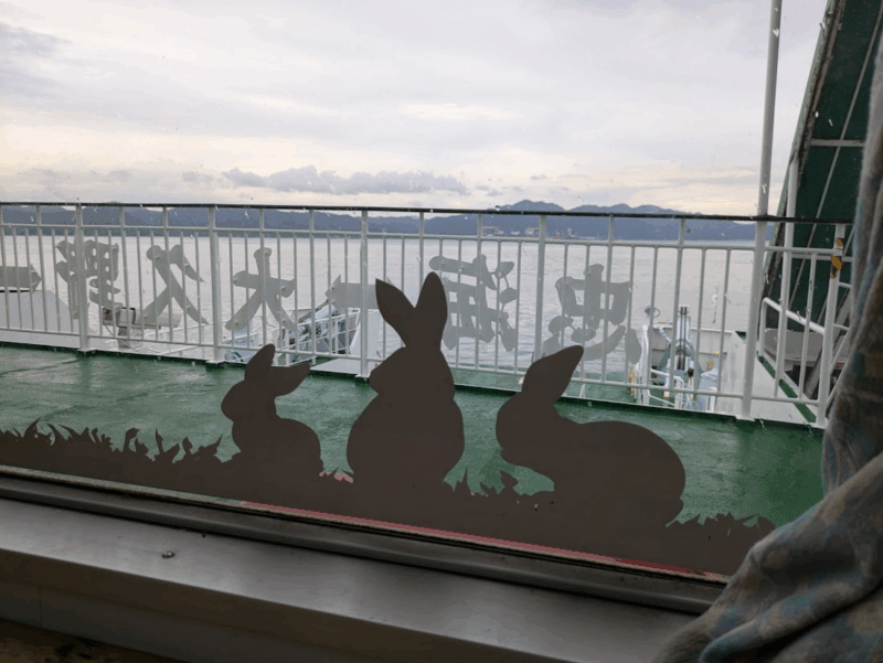 フェリーで15分、あっという間に大久野島に到着です。大久野島には野生のウサギが600羽ほど住み着いていて、世界中からうさぎ好きが集まる聖地。うさぎ好きの彼女が一度訪れてみたい!ということで、今回の旅のハイライトです。