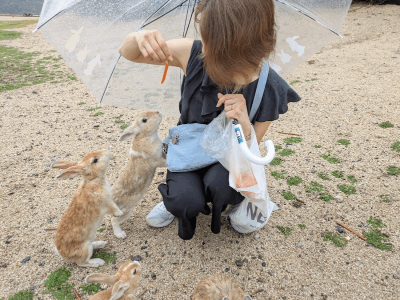 無人島ですが休暇島大久野島というホテルが1つだけあり、今回はこちらに宿泊。チェックインしてから、さっそくあらかじめ用意してきた人参4本から切り出したスティックとキャベツ1玉を携えて島内をお散歩しました。