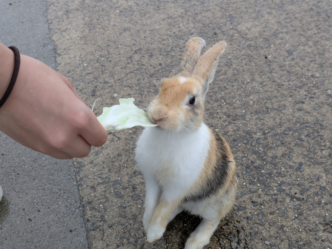 無人島ですが休暇島大久野島というホテルが1つだけあり、今回はこちらに宿泊。チェックインしてから、さっそくあらかじめ用意してきた人参4本から切り出したスティックとキャベツ1玉を携えて島内をお散歩しました。