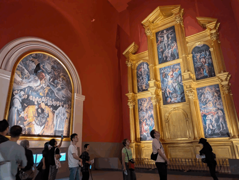エル・グレコの空間では、代表作のひとつ「オルガス伯の埋葬」(左)、「祭壇衝立(エル・エスコリアル修道院用祭壇画)」(右)が原寸大で再現されています。