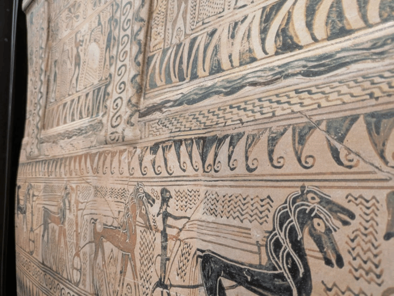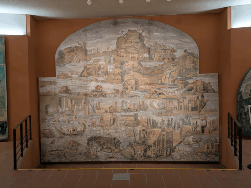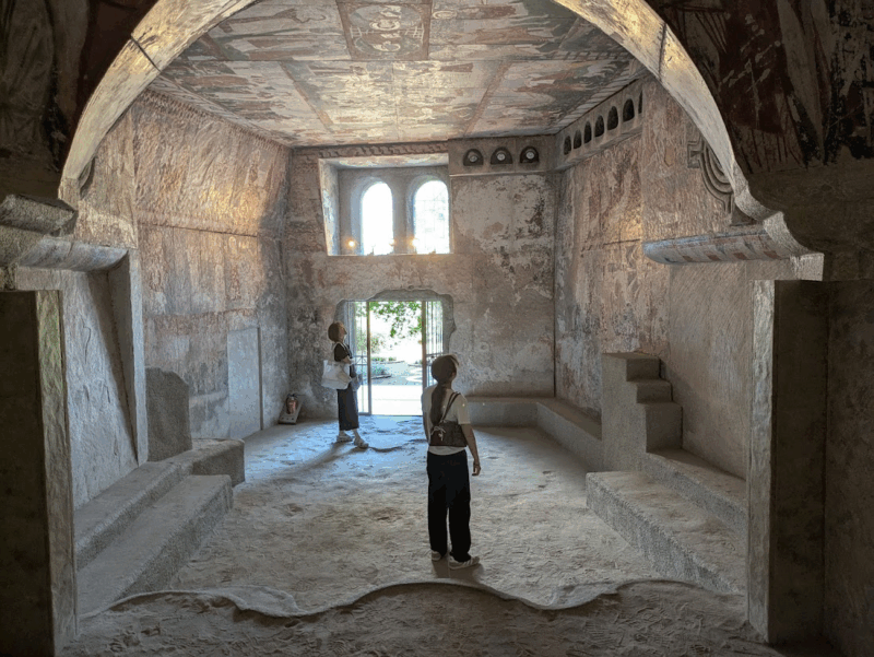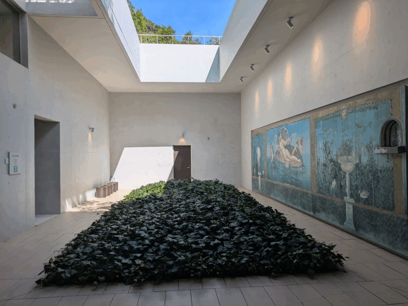自然光が差し込む展示室では、ポンペイの遺跡を思わせる空間が広がっていました。長い壁に描かれた美しい壁画と、手前に広がる緑の地面が幻想的な雰囲気。紀元1世紀に描かれたとは思えないほど、鮮やかな色彩に感動しました。