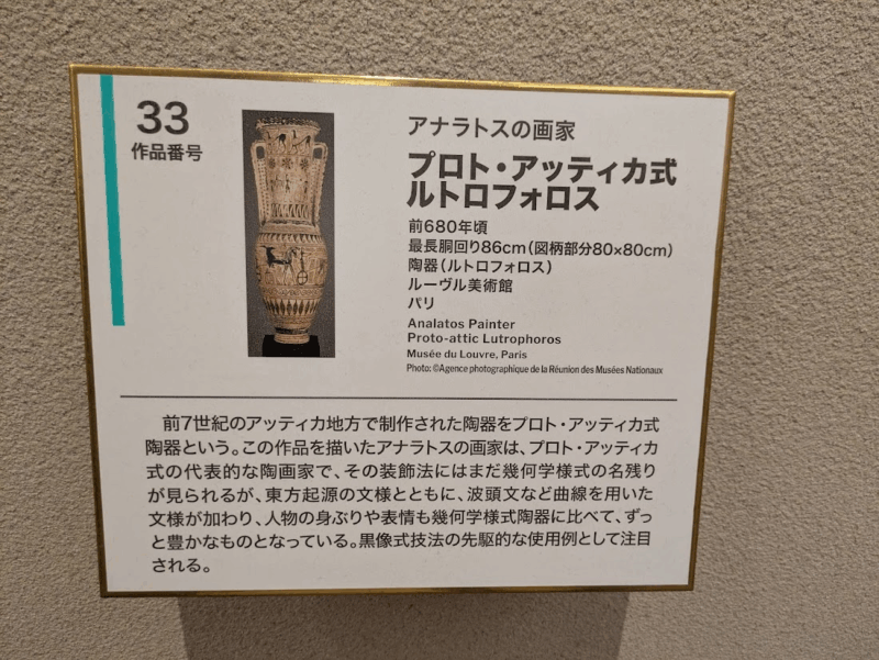 紀元前680年頃、古代ギリシャのアッティカ地方で作られたという水差しの絵を1枚の平面に再現した作品がありました。3次元の絵を2次元に投射して再現するというのも大塚国際美術館ならではのユニークな展示です。