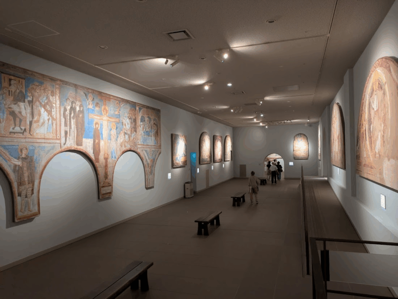 ギリシャ・テサロニキの「聖ニコラオス・オルファノス聖堂」のフレスコ画も現地の環境が再現されて展示されています。この聖堂は、14世紀初頭の後期ビザンティン時代に描かれた壁画で埋め尽くされており、世界遺産にも登録されているそう。