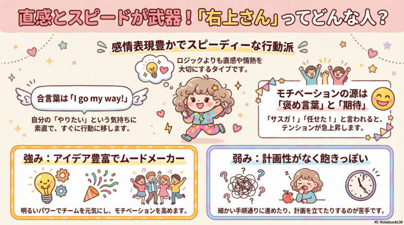 - 強みとして発揮:アイディア豊富、楽しいことや活気あることが好き、モチベーションを上げる