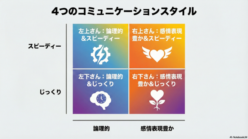 縦軸にスピーディーじっくり、横軸に論理的ー感情表現の4象限で整理すると、次のような4つのコミュニケーションスタイルに分類できます。