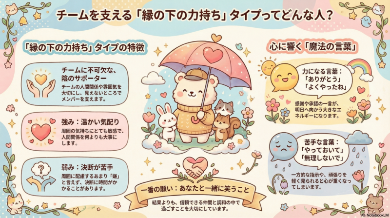 右下さんは、どんな組織にも不可欠な縁の下の力持ち。いつもチームの人間関係や雰囲気を大切にして、見えないところでメンバーに手を差し伸べて支えてくれます。