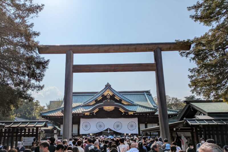 靖国神社で外せないのが、ニュースでもおなじみの桜の標本木です。標本木は東京の桜の開花宣言を判断するための基準となるソメイヨシノ。この日も多くの人がその姿を写真に収めていました。